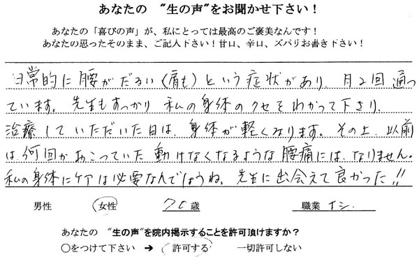 京都 向日市在住(整体) - 日常的に腰がだるい(肩も)という症状があり、月2回通っています。私の身体のクセをわかって下さり、治療していただいた日は、身体が軽くなります。その上、以前は何回かおこっていた動けなくなるような腰痛にはなりません。