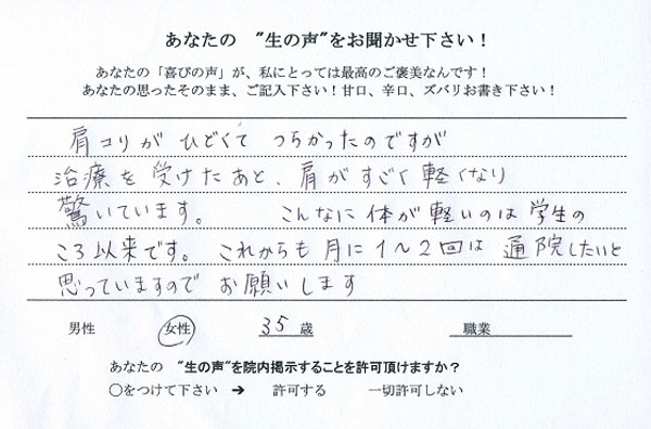 京都 長岡京市在住(整体) - 肩こりがひどくてつらかったのですが、治療をうけたあと、肩がすごく軽くなり驚いています。こんなに体が軽いのは学生のころ以来です。これからも月に1~2回は通院したいと思っています。