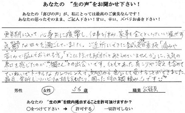 ご近所にできた鍼灸院の看板「痛みや苦しみで悩んでおられる方」「どこに行っても駄目だとあきらめていませんか」に元気の糸口を感じたのか“綱さん”との出会いです。 - もともとあった肩コリや冷えを含めて、ていねいでトータルなカンファレンスで初回から安心して受けることができました。