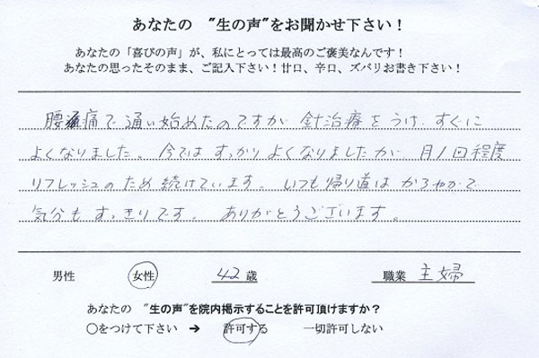 京都 京都市在住(針灸) - 腰痛で通い始めたのですが針治療をうけすぐによくなりました。今ではすっかりよくなりましたが、月に1回程度リフレシュのため続けています。いつも帰り道はかろやかで気分もすっきりです。ありがとうございます。